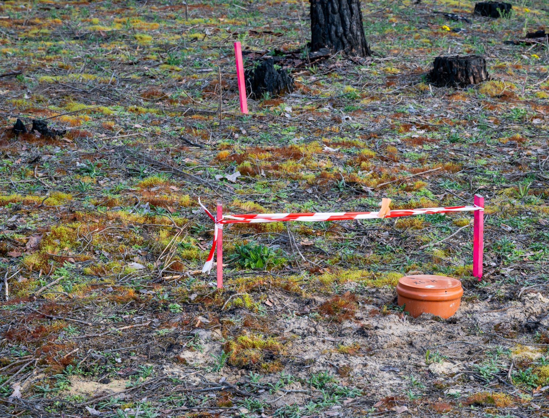 Nach dem Brand wurden die Untersuchungsflächen unterschiedlich behandelt. Hier knüpften die PYROPHOB-Forscher*innen zu Projektbeginn im Mai 2020 an. Insgesamt ergaben sich 15 Behandlungsvarianten (treatments) mit je 10 Probepunkten (Plots), davon je drei so genannte Hauptprobekreise (VIP = Very Important Plot). An jedem Plot erfolgen Messungen abiotischer und biotischer Faktoren.